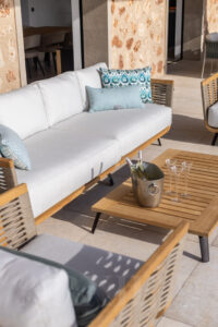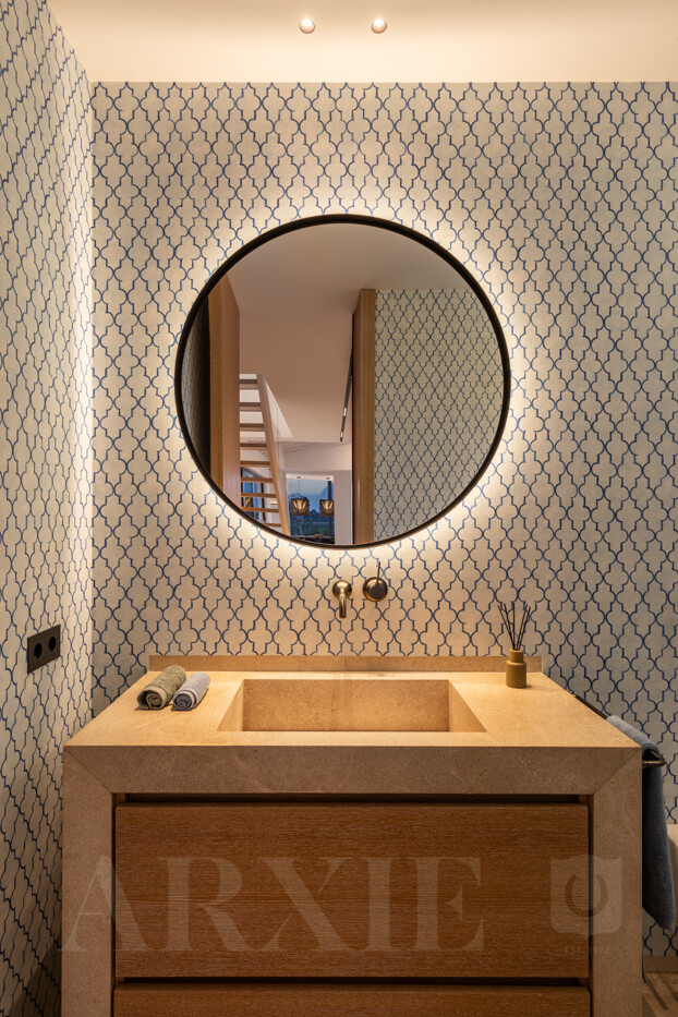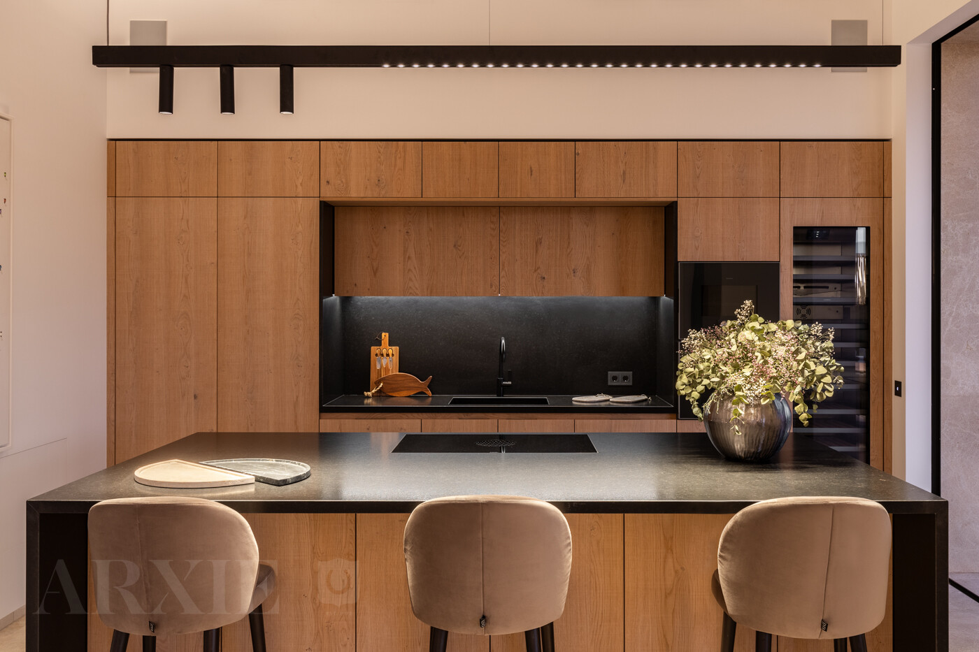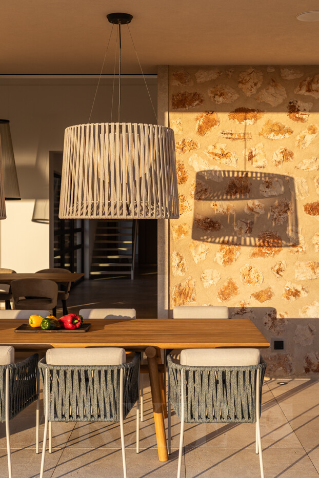 Los 455 m² de espacio habitable se extienden en dos niveles y combinan la piedra natural tradicional con cálidos elementos de madera y un armonioso concepto de color e iluminación. En la planta baja, una espaciosa entrada conduce al ala izquierda: Aquí se encuentra la elegante zona de estar y comedor con chimenea, así como la lujosa cocina, equipada con electrodomésticos Gaggenau de alta calidad. El sistema Sonos instalado en toda la casa garantiza una impresionante experiencia musical en todas las habitaciones.