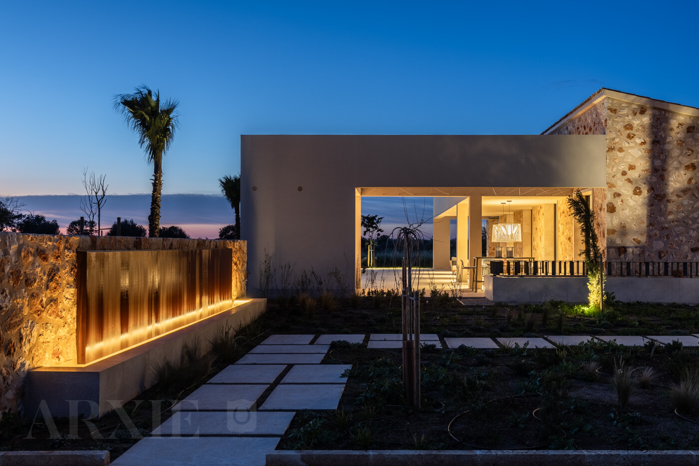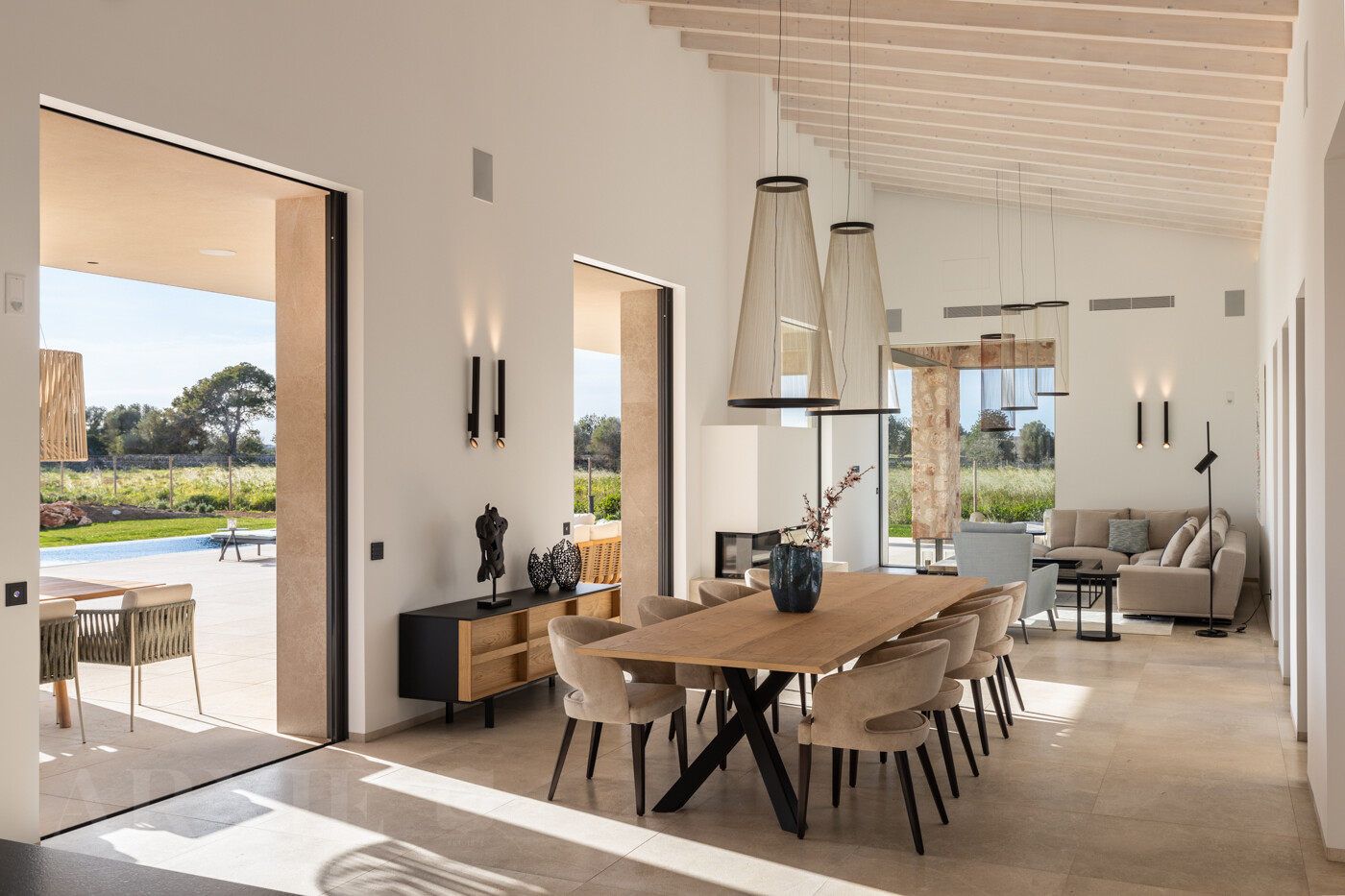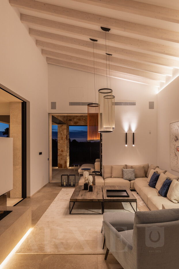 Esta excepcional finca se encuentra a pocos minutos de Cala Llombards en una parcela de 17.757 m². La propiedad, construida en 2024, le da la bienvenida con un largo camino de entrada bordeado de olivos e impresiona por su arquitectura minimalista y sus grandes fachadas acristaladas, que crean un ambiente luminoso y lleno de luz.